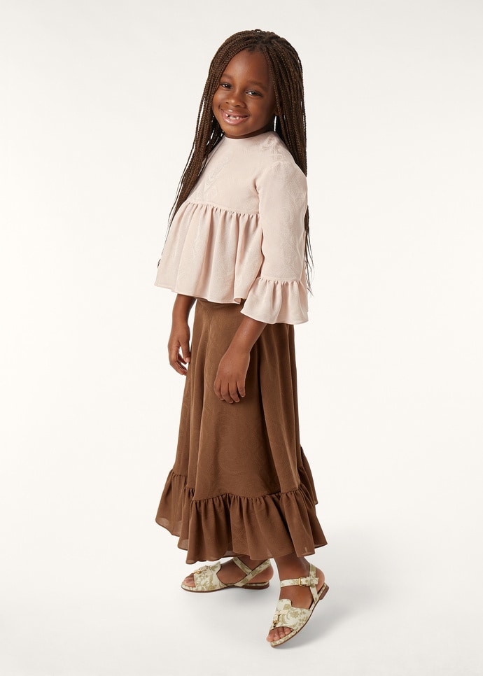 Part of the Ramadan Capsule, the Kate shirt is rendered in fine silk crepe embellished with a geometric jacquard pattern. The silhouette is gathered at the cuff and waist and creates a flowing, voluminous line with soft pleats through the hem. Its back fastening is traced with a row of gold-tone Sergio buttons – a discreet signature detail.