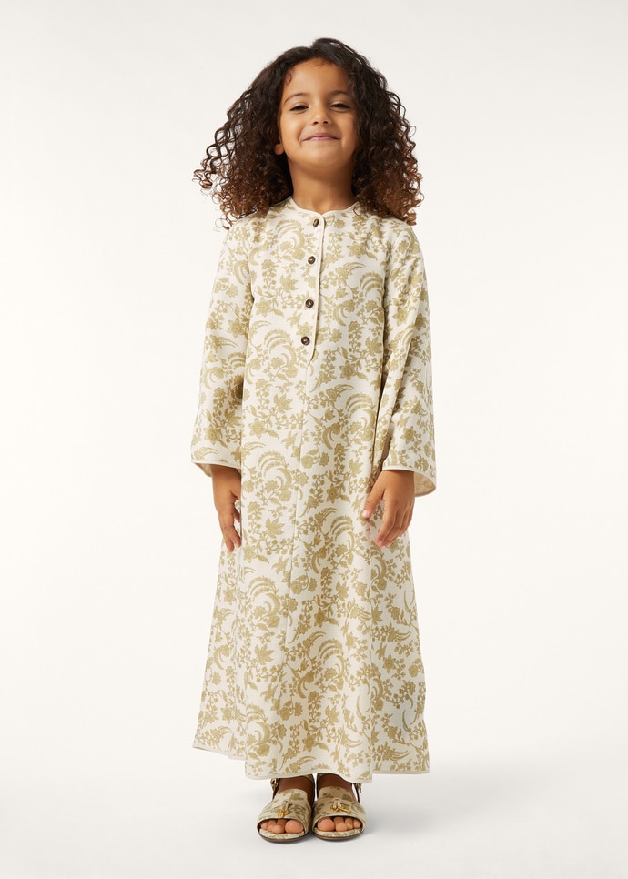 A charming option for their Ramadan celebrations, the Layla dress from the Ramadan Capsule is crafted from a fluid silk blend – its surface animated with exquisite floral motifs. The borders, traced in silk, add dimension to the flared silhouette, with a row of horn-effect Sergio buttons lending a Loro Piana finish.